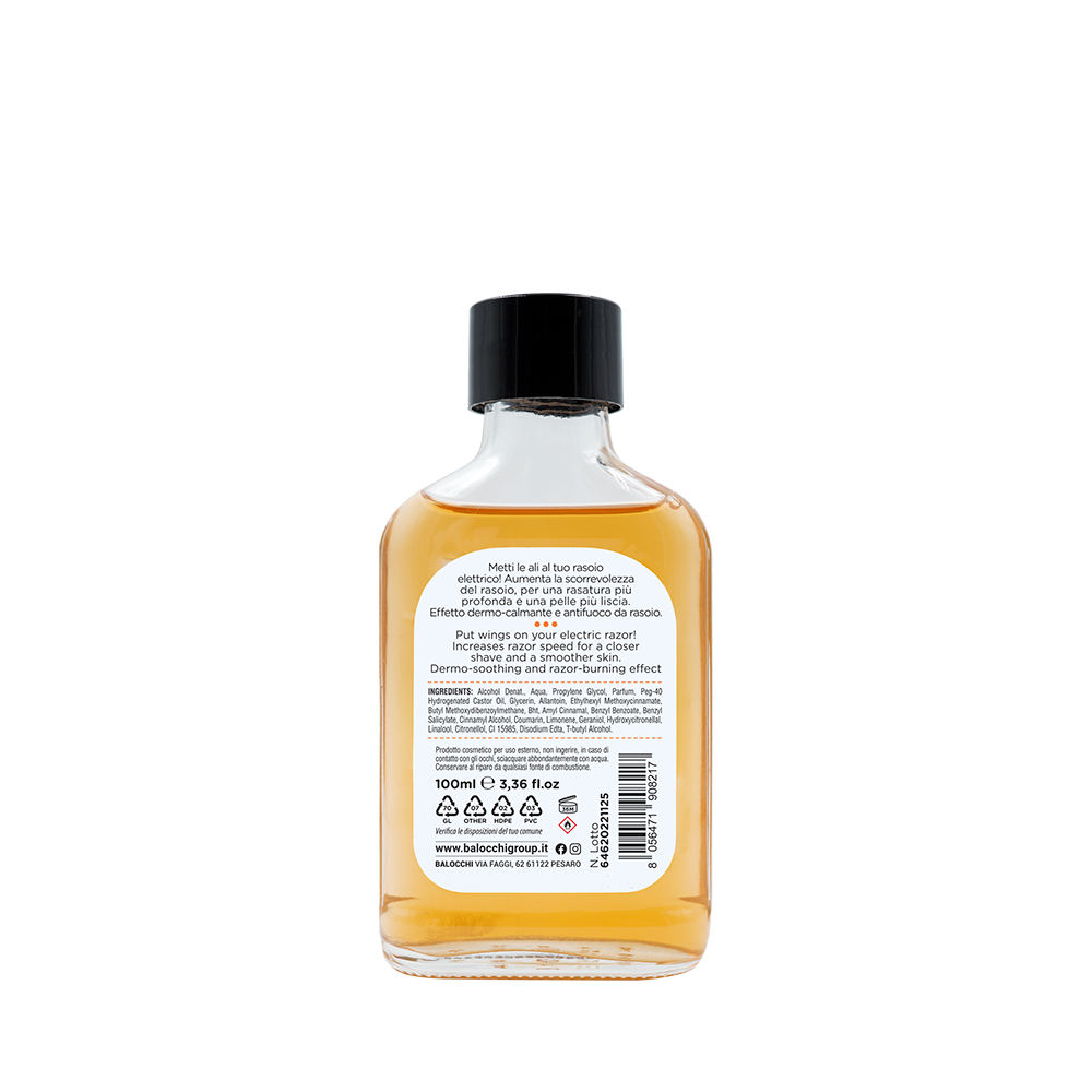 Modo d’uso: applicare un generoso splash sul viso prima di procedere alla rasatura elettrica.
